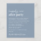 Minsta moderna och budgetvänliga dammblått bröllop/elopement-meddelande och mottagningsinbjudan. Framsidan har "Lyckligtvis allt efter Party" i ett vitt skript i contemporaryn och vit typografi i fet trendig. Anpassa ditt meddelande och inbjudan mer i detalj och lägg till namnen i ett namnteckning skript. På baksidan finns ditt foto från bröllop, första namn och bröllop.