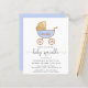 Den här snygga budgetvänliga pojke-sprinkelinbjudan har en blå och guld-vattenfärg på en vagn i baby. Du kan anpassa texten på vagnen eller lämna tom. "Babydusch" är skrivet i en snyggt med dekorationer.