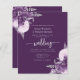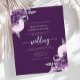 This elegant wedding invitation features purple and lilac floral bouquets set off with silver faux foil greenery in two corners, on a purple background. The customizable text combines silver gray serif, italic and handwriting fonts. The floral design is repeated on the reverse side.