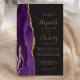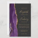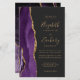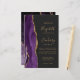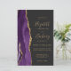 Den vänstra kanten på detta eleganta moderna bröllopsinbjudan har en lila akvarell-agat-kant med falskt guldglitter. Den anpassningsbara texten kombinerar guldfärgad handskrift, kopparplåt och kursiv typsnitt på en off-black bakgrund. Baksidan har en matchande lila och guld-agat-design.