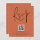 QR-kodskript Bröllop Terracotta OSA. Omslutning för att be dina gäster att söka igenom QR-koden på webbplatsen för bröllop till OSA. Ett budgetvänligt alternativ på 4,5 x 5,6 tum. Finns på ett SEMI GLOSS 110 lb-kort LAGRAR eller ett SATIN AVSLUTAR 80 lb TINNER PAPPRA LAGRAR. En snyggt ställer in typografi i svartvitt för huvudrubrikens OSA som kompletterar resten av texten, vilket du lätt kan anpassa.