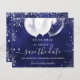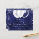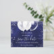 Ett flickigt och trendigt Spara datum-kort för en Quinceañera, 15-årsfest. En marinblå ojämn färgad bakgrund. Dekorerad med falskt silverglitter och vita ballonger. Texten: Spara datum är skriven med en stor trendig handskriven stil.