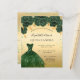 En modern, stilren och glamourös inbjudan till en Quinceañera, 15-årsfest. En falsk guldbakgrund med grön falsk glitterdamm, en smaragdgrön klänning och gröna rosor, blommor. Namnet skrivs med en modern handstilsstil. Anpassa och lägg till din festinformation.