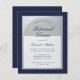En modern inbjudan till repetitionsmiddag. På en marin blå rektangulär bakgrund har den en faux silver-folie som har innanför marin blå text på vit bakgrund. Ord Rehearsal Dinner och namn skrivs i ett kalligrafiskt skript för elegant. Den första raden är bågtext.