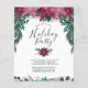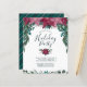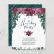 Denna rustika, boho-inspirerade design har en vacker vattenfärgskvasch i form av en bukett med vintage röda och rosa rödröda julstjärnor tillsammans med små bär och frodig vintergrönska på framsidan högst upp, med eukalyptusgrönska och granbarr i nyanser av tealgrönt med subtil förgylld detaljrikedom. Nedanför julstjärnorna står texten "Please join us for a Holiday Party" i populär serif- och kalligrafiskrift för att ge ett handletterat intryck i mörkt tealgrönt, följt av anpassningsbar text för festdetaljer och mer grönska och bär längst ned. Baksidan av kortet har en rik tealgrön bakgrund med diagonala röda, rosa och vita ränder som matchar framsidan. Du kan