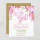 Eleganta rosa och guld flicka budget baby shower inbjudningar. Designen har rosa akvarellblommor, falska guldglittrande blad och ett modernt script-teckensnitt. Designen är platt tryckta illustrationer/grafik - INTE VERKLIGT GULD.