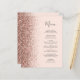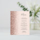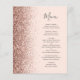 Den vänstra kanten på denna eleganta moderna bröllopsmeny har en falsk glitterkant i roséguld. Den anpassningsbara texten kombinerar kolgrå fantasifull handskriven stil och kopparplåtstypsnitt på en rosafärgad bakgrund. Baksidan har en matchande rosa och roséguld glitterdesign.