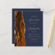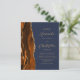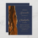 Den vänstra kanten på denna eleganta moderna bröllopsinbjudan har en bränd orange och rost vattenfärg agat-kant med falskt guldglitter. Den anpassningsbara texten kombinerar guldfärgad script och sans serif-teckensnitt på en marinblå bakgrund. Baksidan ger utrymme för bröllopsdetaljer på en enfärgad marinblå bakgrund, tillsammans med en QR-kod som gästerna kan skanna för att besöka er webbplats och svara, vilket sparar kostnaden för att trycka och skicka separata svarsblanketter.