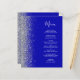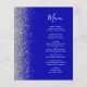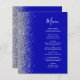 Den vänstra kanten på denna eleganta moderna bröllopsmeny har en silverfärgad falsk glitterkant. Den anpassningsbara texten kombinerar vit handskriven skrift och kopparplåtstypsnitt på en royalblå bakgrund. Baksidan har en matchande royalblå och silverdesign.