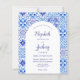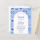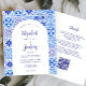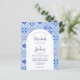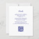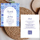 Denna rustika design har ett bakgrundsmönster av blå och vita akvarell portugisiska kakelplattor, eller azulejos. Personalisera den med namnen på bruden och brudgummen i blå kalligrafiskrift och den återstående texten i en kombination av sans serif, kopparstick och kursiv på en vit båge. Baksidan ger utrymme för bröllopsdetaljer på en solid vit bakgrund, tillsammans med en QR-kod som gästerna kan skanna för att besöka er webbplats och svara, vilket sparar kostnaden för att skriva ut och skicka separata svarsblanketter.