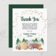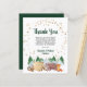 Prisvärd rustik babydopp tackkort med en söt illustration av skogsdjur som tältar i bergen och skogen, en överlagring av guldstjärnor och "Tack" och föräldrarnas namn i ett mörkt jägaregrönt manus.