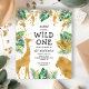 Fira ditt lilla vilda ettårsdag med denna djungel safari-inbjudan, med förgyllda djur (giraff, lejon och apor), guld- och grön djungelvegetation och en strödd förgylld konfetti. Lägg till ditt barns namn och festdetaljer i svart text på vit bakgrund. Ett koordinerande mönster av djungelvegetation i grönt och guld på svart bakgrund pryder baksidan av kortet.