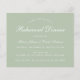 En enkel, minimalistisk rehearsal middagsinbjudan: bara vit text på grön bakgrund. Orden "Rehearsal Middag" och namnen skrivs i ett elegant kalligrafiskt skript, resten i versaler.