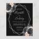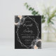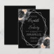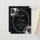 Denna eleganta moderna bröllopsinbjudan har en silvergeometrisk ram dekorerad med persikor, svarta och silverblommor på svart bakgrund. Den anpassningsbara texten kombinerar silvergrå fantasifull handskrift, kopparstick och kursiva stilar. Baksidan är enfärgat svart.