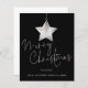 Svart Helgdag-kort för Silver Star God jul. Ett budgeterat prist kort på mindre än 4,5 x 5,6 tum för ditt festliga hälsning på ett glansigt SEMI GLOSS-kort på 110 lb lagrar (liknande ett vykort). Contemporary stil i klassiskt svart med modernt handskript för stil-set för huvudhuvudet och lätt personifiera med hälsning och namn vid grund. En illustration av silver-stjärnan med vattenfärg finns i det övre hörnet. En vit bakgrund är på baksidan som kan ändras till ett annat färg om du vill genom att anpassa ytterligare.