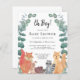 Denna pojkes budgetvänliga Baby Shower är dekorerad med skogsdjur och eukalyptusgrönska.
