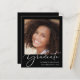 Modern budgetvänlig svart examensutlysning med "Graduate" i ett elegant vitt skript och hennes foto och hennes namn, skola och årskurs i enkel vit typografi.