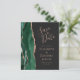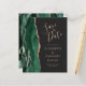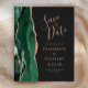 Den vänstra kanten på detta eleganta moderna bröllop save the date-kort har en smaragdgrön akvarellagat-kant med falskt rosa guldglitter. Den anpassningsbara texten kombinerar rosa handskrift, kopparplåt och kursiv stil på en skiffer svart bakgrund. Baksidan har en matchande smaragdgrön och rosa guld-agat-design.