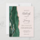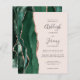 Den vänstra kanten på denna eleganta moderna bröllopsinbjudan har en smaragdgrön akvarell-agat-kant med falskt rosen guldfärg glimmer. Den anpassningsbara texten kombinerar kolgrå handstil, kopparplåt och kursiv stil på en rosafärgad bakgrund. Baksidan har en matchande smaragdgrön och rosen guldfärgad agat-design.