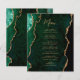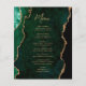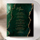 Denna eleganta moderna bröllopsmeny har en smaragdgrön akvarell-agat-kant med falskt guldglitter. Den anpassningsbara texten kombinerar guldfärgad handskriven skrift och kopparplåtstypsnitt. Baksidan har en matchande smaragdgrön och gul agat-design.