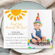 Planerar du en sol-temed pojkes första födelsedagsfest? Den här söta budgetinbjudan är dekorerad med en gult vattenfärgsskripttypografi för sol och snyggt. Anpassade enkelt med ditt foto och information. Ursprunglig vattenfärg © Michele Davies.