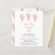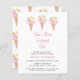 Den här söt glassbudgeten inbjudningskort för möhippan är dekorerad med tre glaskrämar och blommor. I texten står det: "Hon har blivit lurad!" i snyggtens rosa. Du kan anpassa det här kortet genom att lägga till duschinformation. Ursprunglig vattenfärg © Michele Davies.