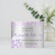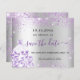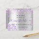 Ett flickigt och trendigt Spara datumet-kort för en Sweet 16, 16-års födelsedagsfest. En modern falsk silverfärgad bakgrund dekorerad med lila falskt glitterdamm och en klänning. Anpassa och lägg till ett datum och namn/ålder. Svarta och lila färgade bokstäver. Texten: Spara datumet är skriven med en stor trendig handskriven stil.