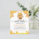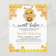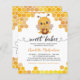 Denna söta budget inbjudan till baby shower har en textbild "Söt Babee" med en bin som håller en burk honung omgiven av bikakor. Baksidan har bikakor, burkar med honung och flygande bin. Lätt att anpassa genom att klicka på "Personifiera".
