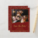 Elegant burgundröd och guld konetti bakgrund ramar 3 av dina pars foton. Texten är djupt guld. Spara datumet skrivs i en fet skripttext. 4 linjer text låt beskriva dina bröllop-planer för dina gäster.