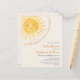 Denna söta budgetbabyshower-inbjudan har texten "Vår lilla solstråle är nästan här!" med en akvarell leende gul sol på en mjuk krämfärgad bakgrund.