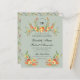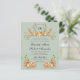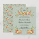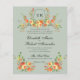 Utforma handmålade blommigtar med vattenfärg i orangens, de röda och mjuka gröntarnas varma solnedgångshus med gröntens bakgrund. En vapensköld för blommigt av vibrerande blommar med monogram. Den typografi som används är ett kalligrafiskt skript för elegant med traditionellt serif typsnitt. Baksidan av inbjudan fortsätter det naturinspirerade temat med ett känsligt blommönster.