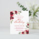 Red roses and blush pink peonies are nestled in dark green leaves on this beautiful and unique birthday invitation.