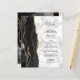 Den vänstra kanten på denna eleganta moderna bröllopsmeny har en svart akvarell-agat-kant med falskt guldglitter. Den anpassningsbara texten kombinerar svart och guld-färgad handskriven skrift och kopparplåtstypsnitt på en grå och vit marmorbakgrund. Baksidan har en matchande svart och guld-agat-design.