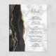 Den vänstra kanten på denna eleganta moderna bröllopsmeny har en svart akrylmålning agat kant med falskt guld glitter. Den anpassningsbara texten kombinerar svart och guld-färgad handskriven skrift och kopparplåtstypsnitt på en grå och vit marmorerad bakgrund. Baksidan har en matchande svart och guld agat design.