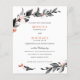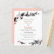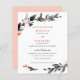 Elegant blad- och blominspirerad bröllopsinbjudan med ömtåliga grenar av lövverk i svart, grått rosa och korall på vit bakgrund.