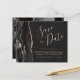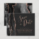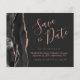 Detta eleganta budget sparar datum-kort har en svart akvarell-agat kant med falskt roséguld glitter. Den anpassningsbara texten kombinerar rosafärgad handskriven skrift, kopparplåt och kursiv stil på en kolgrå bakgrund. Baksidan har en matchande svart och roséguld-agat design.