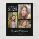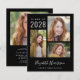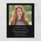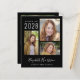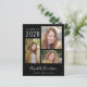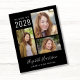 Budgetvänlig svart examensannonsering och festinbjudan med en 3-bildsfotocollage, "Graduate" i ett stilrent vitt manus och examenklassens namn, år och skola eller universitet i modern vit typografi. På baksidan läggs ett extra foto till och dina detaljer om examensfesten.