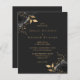 Den här romantiska bröllopsinbjudan till blommigt innehåller svarta blommigtar som är utfällda med guld-faux-folieblad i två hörn. Parets namn visas i det klassiska guld-färgad-serikteckensnittet, med resterande text i kursiv stil, på en mörk skiffersvart bakgrund. Kortets baksida är massiv skiffersvart.
