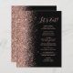 Den moderna bröllop-menyn på den lämnat kant i eleganten har en faux glitter gräns i ro i guld. I anpassadets titel och text kombineras ro rosa visstilskript och mönsterskylt typsnitt mot svart bakgrund. Den omvända sidan har en matchande design för svart och ro guld glitter.