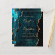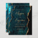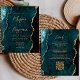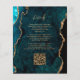 Den här inbjudan från elegant bröllop innehåller en bakgrundsbild av färgblått vattenfärgat färgagat trimmat med faux guld glitter. Anpassadet kombinerar modern handskrift, tryckplåt och kursivt typsnitt med guld-färgad. På baksidan finns utrymme för bröllop-information på en matchande bakgrunden för teal agate, tillsammans med en QR-kodgäst som kan söka på webbplatsen och OSAN, vilket sparar kostnaderna för utskrift och utskick av separat OSA kort.