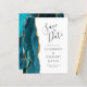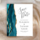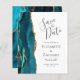 Vänstra kanten på detta eleganta moderna bröllopskort för spara datum har en tealblå akvarell-agat kant med falskt guldglitter. Den anpassningsbara texten kombinerar kolgrå handstil, kopparplåt och kursiv stil på vit bakgrund. Baksidan har en matchande tealblå och guld-agat-design.