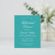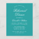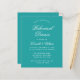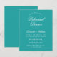 En enkel inbjudan till middag med en modern färg: turkos. Den har bara vit text på turkos blå bakgrund. Orden "Rehearsal Dinner" och namnet är skrivna med ett elegant kalligrafiskt typsnitt.