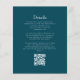 Den här inbjudan från elegant bröllop har en parallellblått skript i monogram som inledningsvis omges av en botanisk andedräkt. Namn visas i färgskript, medan resten av texten visas i klassiskt serif-teckensnitt. Den omvända sidan ger plats för bröllop-information på en helfärgad tealblått bakgrund, tillsammans med en QR-kodgäst som kan besöka webbplatsen och OSAN.