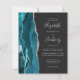 Den vänstra kanten på denna eleganta moderna bröllopsinbjudan har en tealblå akvarellagat-kant med falskt silverglitter. Den anpassningsbara texten kombinerar silvergrå handskrift, kopparstick- och kursivtypsnitt på en mörk, nästan svart bakgrund. Baksidan har utrymme för 4 foton (1 fyrkantig, 2 horisontella, 1 lång vertikal) och plats för din bröllopswebbadress eller annan information.