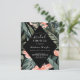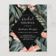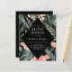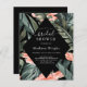 Denna budget, den svarta tropiska Blommigten Inbjudningskort för möhippan, dekorerade med tropiska blommor, handflatan löv och grenar och elegant vit text. Inbjudans baksida är svart.