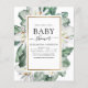 Budgeterade tropiska Magnolia Flowers med Blommigt Greenery Handflatan och Faux Gold Foil Geometric Gräns Vår eller Summer Baby Shower Investigations - innehåller vackra och elegant manustypografi med moderna tropiska botaniska blommor och gieneri för att speciella Mor ska kunna vara firande och förvänta sig en pojke-, flicka- eller könsneutral leverans.