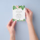 Budget Tropiska Gröna Palmblad och Rosafärgade Blommor Vattenfärg Vattenfärg Vår eller Sommar Bröllopsfoto eller Bröllopskort - inkluderar vacker och elegant skript typografi med moderna tropiska botaniska blommor och grönska för den speciella bröllopsdagens firande.