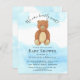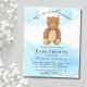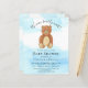 Denna budgetpar baby shower-inbjudan är dekorerad med en söt akvarellbjörn på en himmelbakgrund och orden "vi kan knappast vänta!"