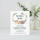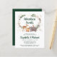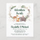 Söt budgetvänlig rustik vinter par barnkalas inbjudan med akvarell illustrationer av skogsdjur, blommor, grönska och guldstjärnor och snöflingor. "Äventyr Väntar" och de blivande föräldrarnas namn skrivs i en skoggrön skrift.
