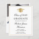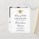 Elegant budgetvänlig vit högskoleexamen festinbjudan med en guldfärgad examenshatt, examenets namn och år i ett kalligrafiskrift, och deras skola, huvudämne och hedersbetyg i klassisk serif typografi. På baksidan kan du lägga till ett foto och anpassa dina festdetaljer. Detta budget semi-glanspapper har liknande vikt som fotopapper - en större traditionell kartongversion finns också tillgänglig (skicka oss ett meddelande för länken).